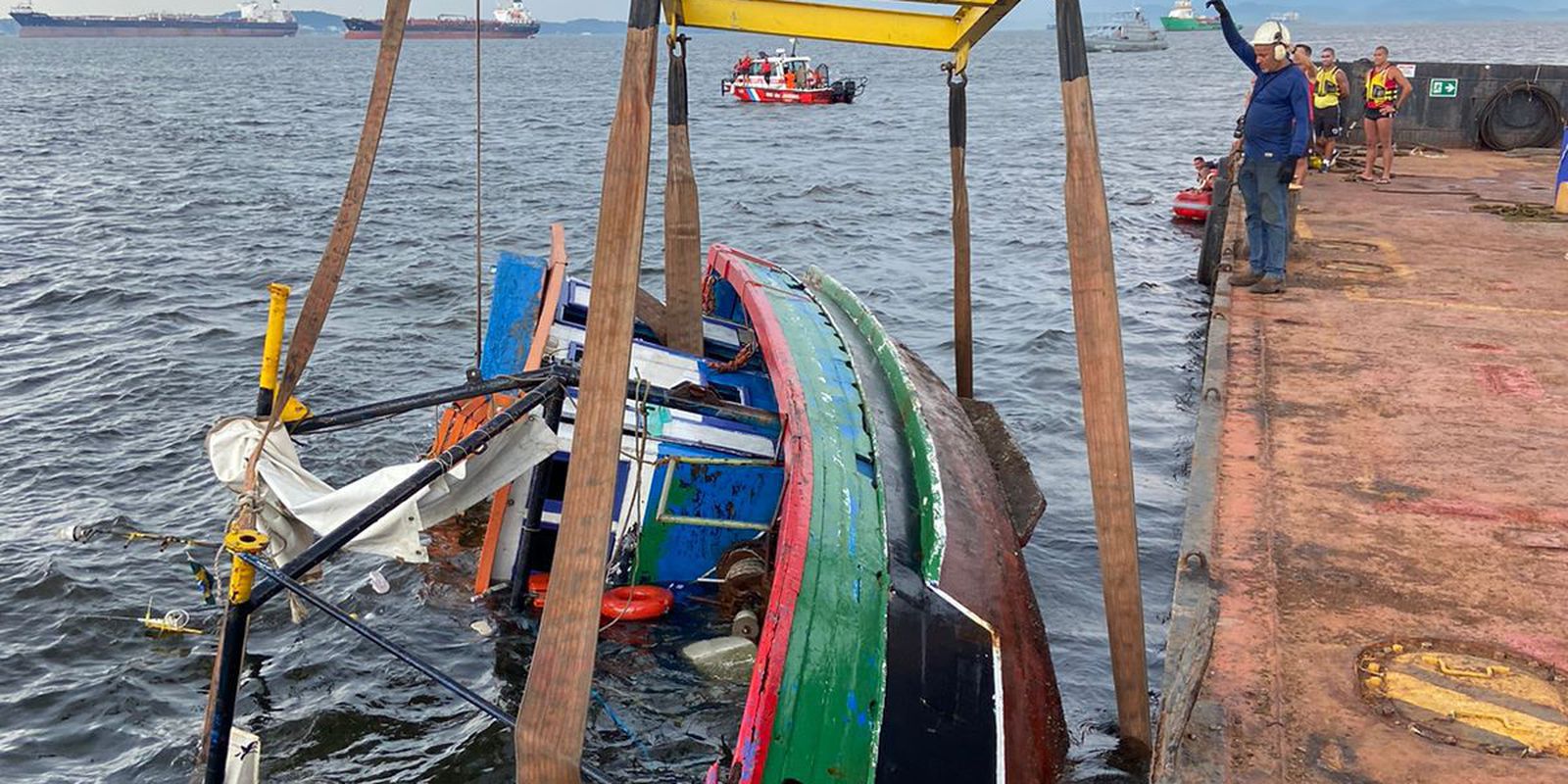O Corpo de Bombeiros conseguiu içar a embarcação Caiçara da Baía de Guanabara, que agora será levada à Capitania dos Portos para passar por perícia.